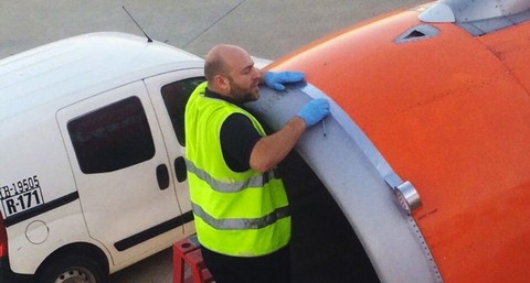 エンジニアがフライト前にエンジン周りをテープで補強