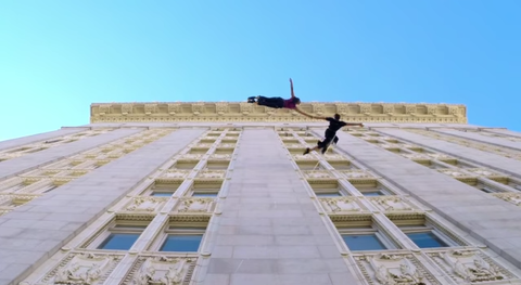 17階建てのビンテージビルの側面でワルツを踊る動画